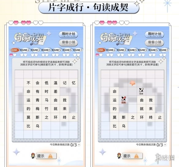 活动期间,[句读成契]连字消除小游戏每天凌晨5点会解锁新关卡,每日挑战次数是有限的,要是错过了可以消耗北极星来补购挑战次数。