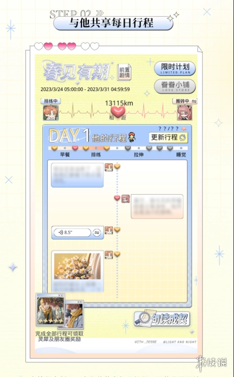 活动简介:融融絮语,说与你听——小别之时,在情侣定制APP上与他共享每日行程,完成7日全部行程即可获取[5星]灵犀 夏鸣星・驰日环游 以及纪念朋友圈。完成限时计划的指定任务还能得到情侣头像・侧耳倾听。