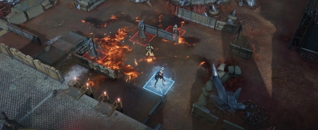 主动技能【月夜深嚎】兼具战术位移与团队增益两种作用:索普会跃迁至指定的空置地格(此地格需已存在冷凝或燃烧类效果),落地后为范围内所有友方单位施加“杀戮踪迹”状态——处于该状态时,友方单位主动攻击目标,若目标周围有“霜冻”地格,就会对目标处于异位格(也就是非相邻格)的敌人提升额外伤害;技能生效后,索普会强制切换到“狂犬”形态。