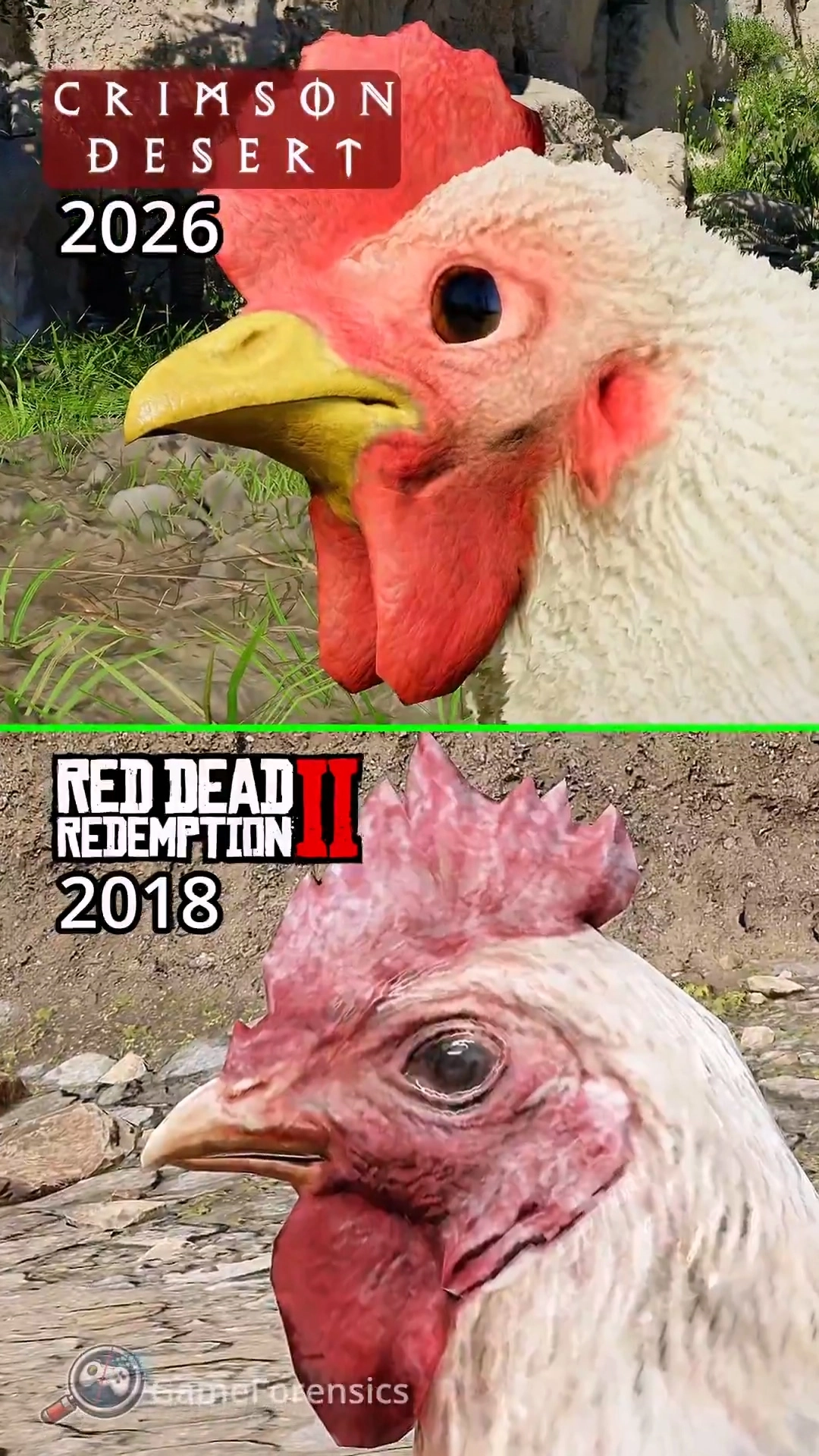 第一个是从对小鸡这类动物的模拟角度来进行对比。大家都知道,R星旗下的《荒野大镖客2》在物理模拟方面做得十分出色,游戏里处处都体现着各种细腻的小细节。之前《生化危机9》的布料机制已经被它比下去了,而这次轮到《红色沙漠》里的小鸡被拿来比较了……