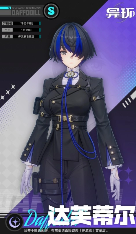 达芙蒂尔是暗属性的异能输出型角色,普通攻击是双刃五段斩击,会附加暗属性异能伤害;长按普攻能够向前突进,施展旋风急斩,并且在移动路径上留下持续生效的印痕,对经过的敌人造成额外伤害。“同振”技能一开始是单体暗属性输出,当队伍里其他角色释放援护技能时,这个技能可以叠加层数,每一层都会提高基础伤害和“倾陷值”,叠满两层后技能形态会发生进化,变成绳索缠绕加双刃轮斩,伤害类型依旧是暗属性异能。“交刃”属于瞬发的单体暗属性异能技,没有附加效果。“见此终幕”是范围暗属性异能终结技,命中目标后会解放左眼,进入强化状态:在此期间自身所有伤害都会提升,同时给范围内的全部敌人施加“洞察”状态,对后续的战术协同产生影响。