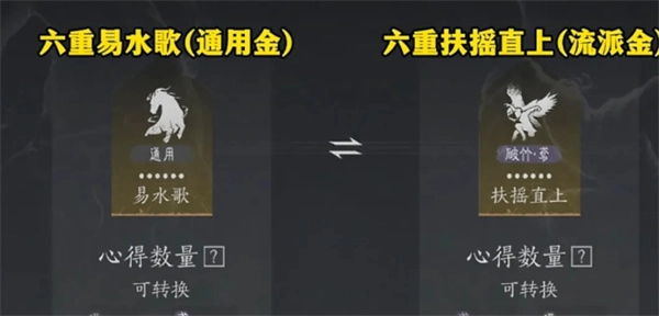 4、因此,玩家在培养心法的过程中,需要始终锁定易水歌。当易水歌的心法数量达到603本,同时我们计划培养的那本流派金心法数量也达到266本时,就可以将这两种心法进行互相转换。完成转换后,就能获得一个六重的易水歌和一个六重的流派金心法了。
