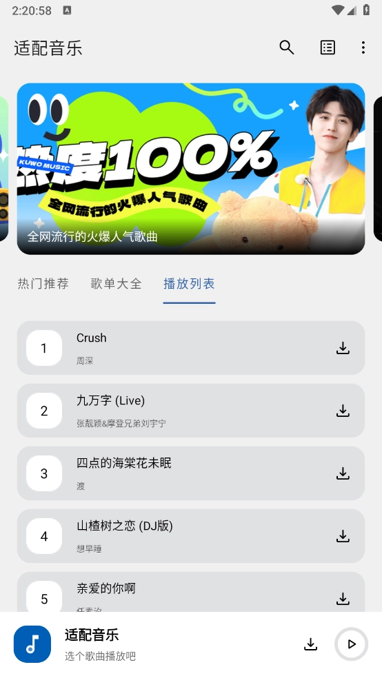 适配音乐,轻便好用的免费音乐app,该软件占用空间小、界面简洁直观,聚合了丰富全面的音乐资源并保持同步更新。使用过程干扰,支持自由搜索歌曲,支持无损音质播放、歌词适配,自由搜索想听的歌曲。