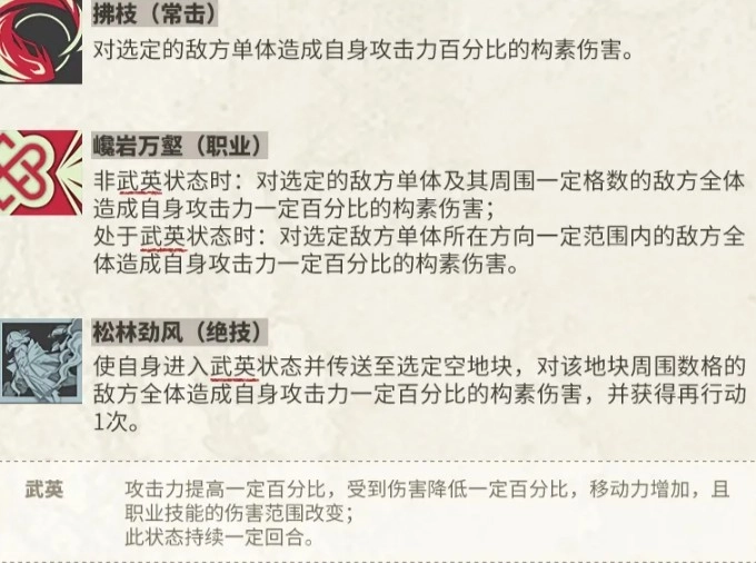 非武英状态下:对指定的敌方单体及其周边特定格数内的所有敌方目标,造成基于自身攻击力一定百分比的构素伤害;处于武英状态时:对选定敌方单体所在方向特定范围内的全体敌方,造成自身攻击力一定百分比的构素伤害。