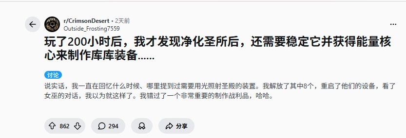 这条帖子很快就激起了许多人的共鸣。获赞最多的评论说:“你和几乎所有的人都是这样的。”另一位用户直接说道:“你说还有个额外步骤?搞什么啊?”也有人表示:“我刚完成了第一批净化,根本不明白你在说什么,游戏里从来没提到过这回事。”