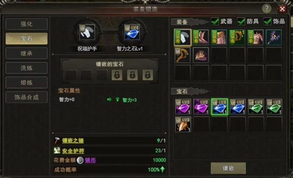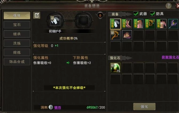 4、要是属性点和魂石都已经优化到足够好的状态,还是没办法通过副本,那就得把重点放在提升装备上了。装备强化是有技巧的,特别是绑定规则,新手一定要记清楚,不然很容易吃大亏。强化石有武器强化石和防具强化石两种,得对应着强化,不能混着用;1级到6级的强化成功率是100%,可以放心直接强化,不用怕失败;武器和装备强化的最高等级是+20,前期建议强化到+10就可以了,这样方便后面更换装备的时候进行装备转移(强化超过+10再转移需要消耗转移卷轴,前期不建议浪费资源);6级之后强化成功率会降低,建议使用“魔龙之血”(祝福值满了能提高强化概率)和“安全强化护符”(勾选之后,强化失败不会掉级,避免前期的资源白白浪费)。