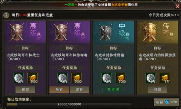 6、主线任务完成后,日常提升的关键就在于“悬赏任务”,每日能完成10次,是前期获取经验、资源的重要渠道,务必优先完成!悬赏任务有等级划分(由高到低):史诗>传奇>高级>中级>初级,建议优先选择史诗、传奇、高级任务,这些任务的奖励更丰富(包括经验、强化石、宝石等),性价比极高。每天有2次免费刷新任务的机会,可借助免费机会刷新任务等级;免费次数用完后,刷新需要消耗20绑定钻石,新手前期钻石比较紧张,不建议浪费;也可以选择不花费钻石,等当前4个任务全部做完后,系统会自动刷新任务列表,这样也能轻松获得高等级任务。