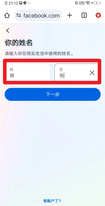 3、请依次填写姓氏与名字,确认信息准确无误后,点击【下一步】按钮。