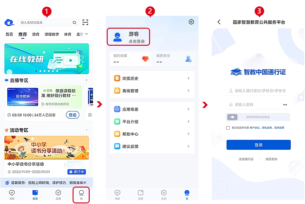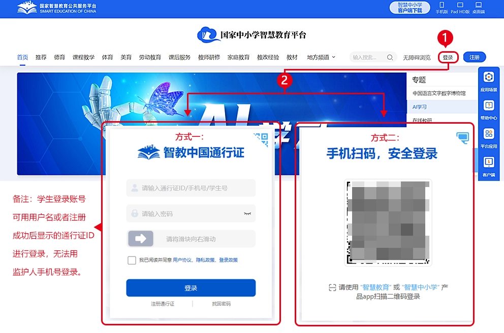 1、网页端:教师与家长可通过首页右上角的【登录】入口,选择注册的通行证ID/手机号搭配密码的方式登录,也能借助“智慧中小学”手机端扫描二维码完成登录。