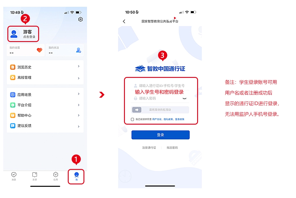 2、手机端:学生可打开“智慧中小学”手机应用,点击底部导航栏的【我】-【登录】进入登录页面,输入学生号与密码完成登录。