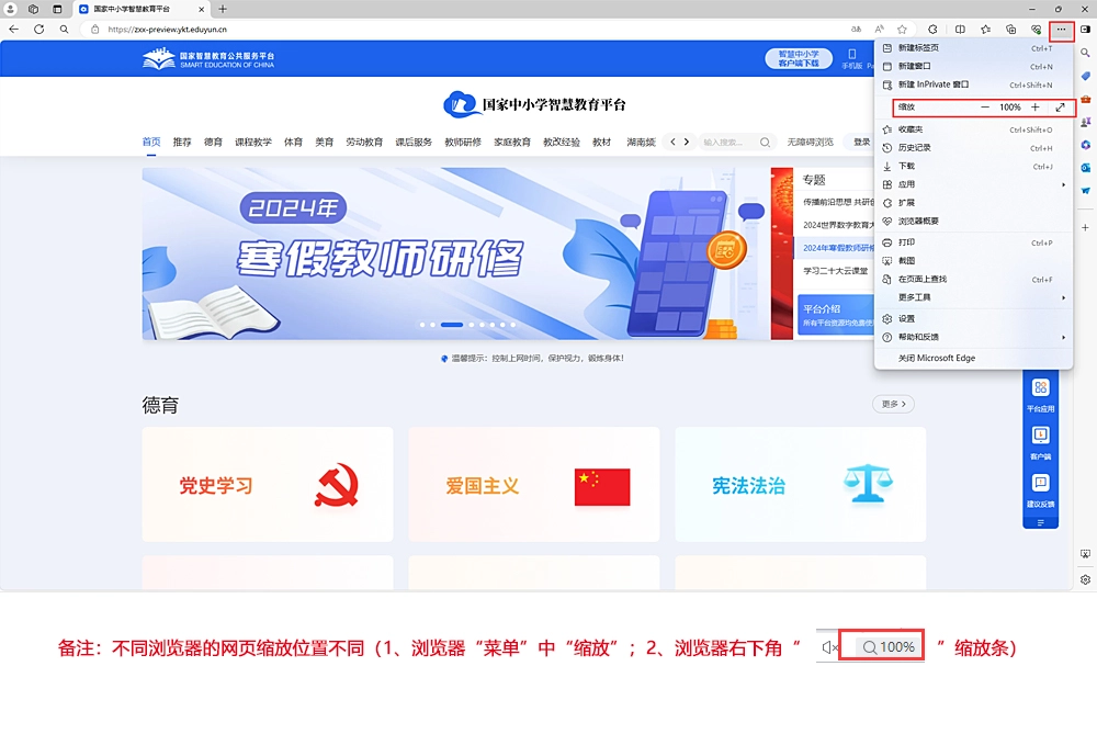 您可以调整浏览器的缩放比例以看到更完整的网页内容。各浏览器的具体操作如图所示。