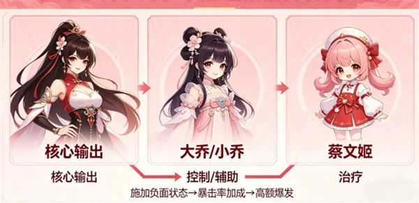 思路:大小乔负责给敌方施加负面状态,为孙尚香提供暴击率加成,打出高额爆发。