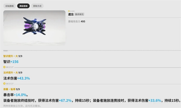 要是不打算抽专武、也没计划买通行证,那其实还有一把武器挺适合庄方宜的——遗忘,这是一把能免费拿到的六星武器。虽说它主要加的是智识属性,但特效真的很实用:不仅能提高佩戴者的暴击率,而且在施放终结技或者连携技的时候,还能进一步提升法术伤害。