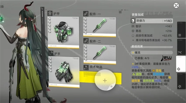 接下来是庄方宜的装备推荐,当前庄方宜的毕业配置为新套装壤流三件套,装备者在消耗导电状态时,会依据异常等级获得相应的强化效果,进而提升庄方宜的电磁伤害,具体搭配可以是壤流轻甲+壤流护手+壤流短棍×2。