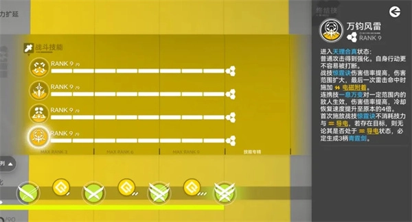 在技能养成方面,庄方宜的核心输出能力主要依赖于释放大招后战技与连携技的输出表现。因此,养成优先级应优先将战技和连携技提升至专精三,之后再考虑提升终极技(待后续养成材料充裕时再进行专精),最后才是普攻。具体优先级排序为:战技>连携技=终极技>普攻。