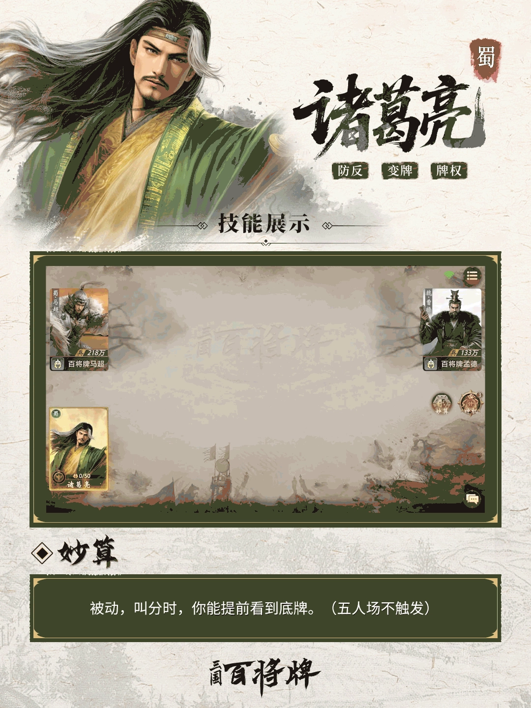 在《三国:百将牌》里,诸葛亮是典型的变牌防反类角色,凭借技能来获取信息和调整手牌结构,在关键回合完成翻盘。他的核心在于对牌权的掌控以及构建炸弹的能力。接下来小编就为大家分享三国百将牌诸葛亮的技能与实战玩法详解。