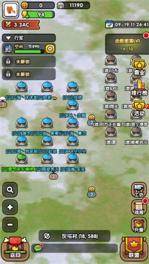 2、战场划分为1至7级的区域,每个等级区域内设有一座城池,且各区域分布着不同等级的部落、遗迹巨人和采集点。缩小地图后,绿色代表自身,蓝色代表同联盟成员,灰色则代表非同盟成员。不同等级的区域会随着霸业进程的时间节点逐步解锁。