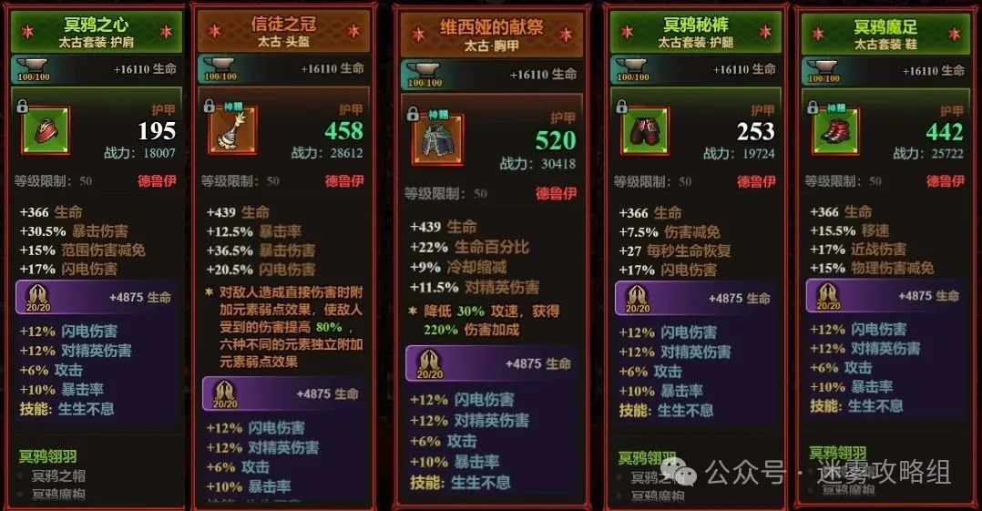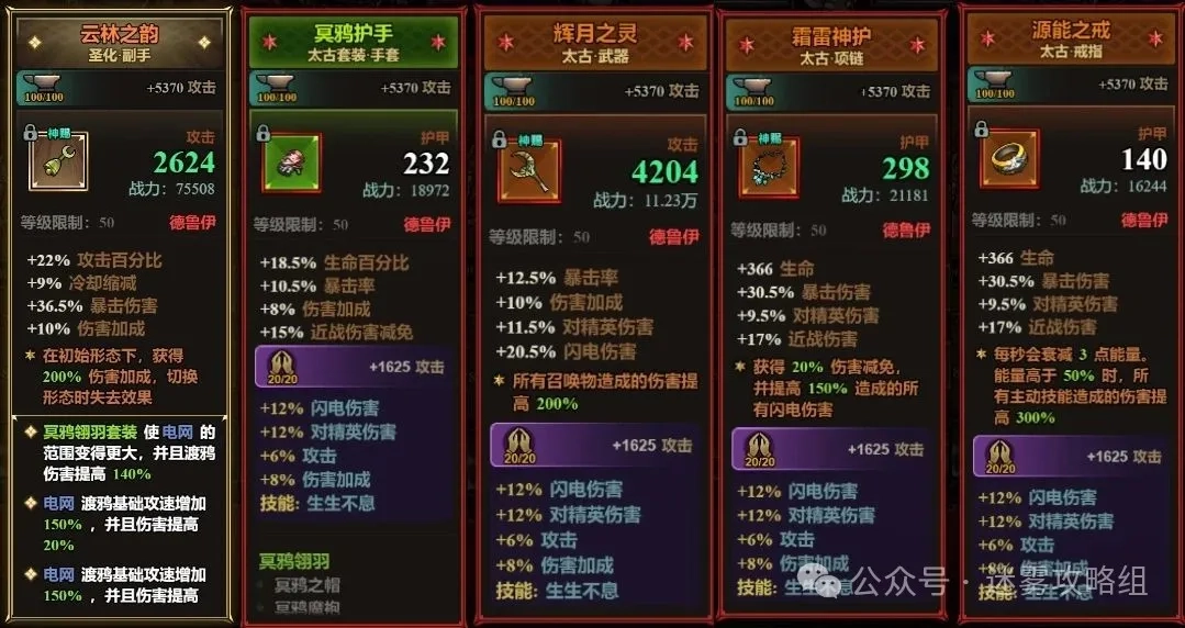 冥鸦四件套(护肩、护腿、鞋子、手套),可增加渡鸦的召唤次数并提升其伤害;头盔选用信徒之冠,该头盔效果为每种元素类型都会让敌人受到的伤害提高,而我们的技能组合包含狼影突袭(物理伤害)、电网(闪电伤害)和荆棘光环(毒素伤害),这三种元素效果独立计算,因此佩戴信徒之冠能带来240%的伤害加成;胸甲搭配维西娅的献祭;戒指选择源能之戒;副手装备森罗万象,由于我们点了狼魂技能,这件副手是必备的,在变身状态下能获得至少340%的伤害加成(最高可达680%)。