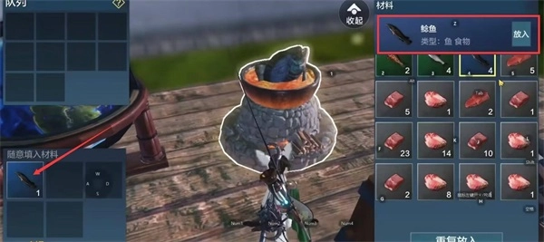 2、把一条品质不低于蓝色的鱼类食材(像鲶鱼这类),放进灶台的原料栏里。