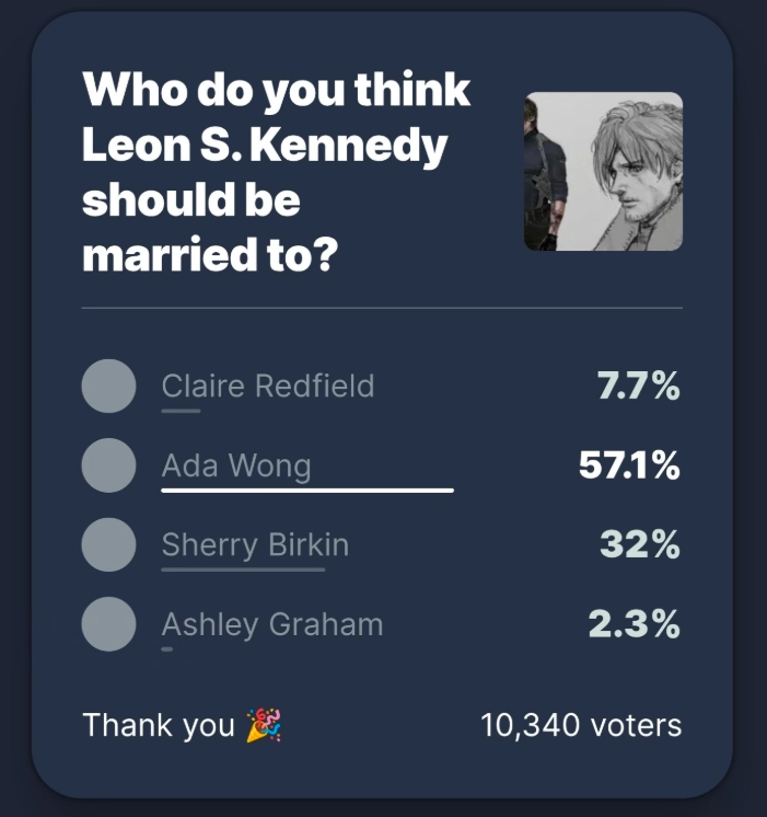在《生化危机9:安魂曲》里,里昂无名指上的戒指让玩家们对“里昂妻子”的身份一直讨论不休。最近,知名游戏媒体IGN针对这个话题发起了一项投票,问题是“你觉得哪个角色最适合成为里昂的妻子”,但投票结果却因为数据出现异常而引发了争议。