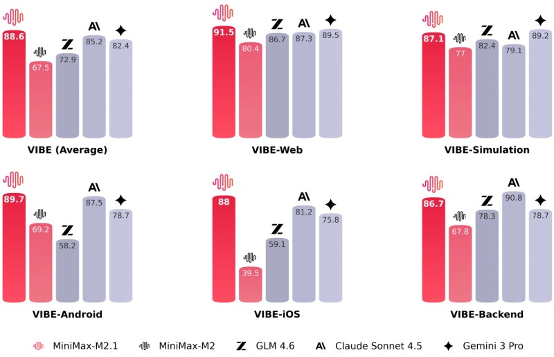 M2.1在VIBE基准测试中表现出公司所称的“出色表现”,平均得分为88.6。它在VIBE-Web和VIBE-Android子集中特别出色,得分分别为91.5和89.7。