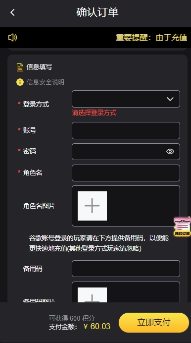 3、确认所购商品信息准确无误后,点击“立即支付”按钮完成支付。支付完成后,在订单页面准确填写游戏账号信息,并联系客服即可。