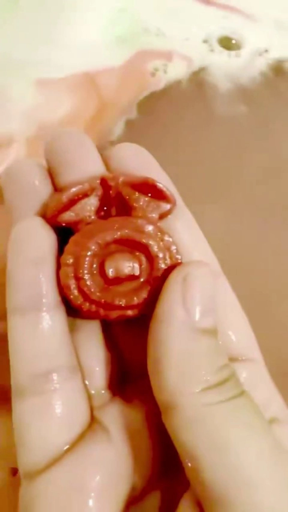 更让粉丝觉得“失望”的是,等泡澡球彻底溶解后,水里并没有出现任何耀西玩偶或者惊喜玩具。出现在眼前的是一块红色的“火之花”香皂——这应该就是红色染料的出处了。