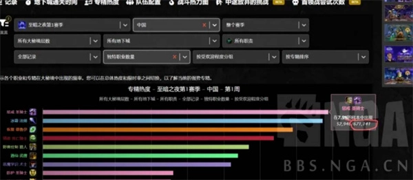 欧服的限时率最高,达到90.6%;美服的限时率为89.4%。相比之下,国服的限时率相对最低,仅85.1%,超时记录的占比明显高于其他两个服务器。在所有专精里,使用次数最多的两个是惩戒骑和冰法——选择惩戒骑的玩家高达67万,冰法以63万的使用人数紧随其后。不过这两个职业在当前全职业强度排名中并不算强势:冰法勉强处于A级,惩戒骑甚至达不到A级,只有B级的强度。既然如此,为什么会有这么多玩家选择它们呢?