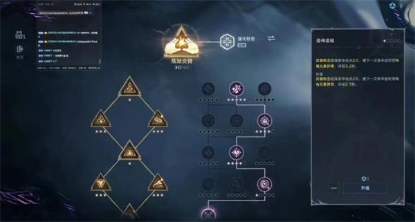6、赛季天赋主动技能优先选择炎臂,对火属性武器爆发阶段的提升效果非常显著。被动天赋方面,若队伍里已有队友携带“狼狩死神”,那就直接选核爆,借助队友频繁触发的元素异常状态来引发大范围的高额爆炸伤害,从而显著提高团队整体输出;要是在常规单刷或者没有特定DEBUFF辅助的情况下,强化射击会是更稳妥的选项,它可以为你的主要输出方式提供稳定的额外伤害加成。
