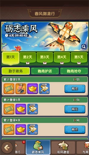 6、玩锦线寻鸢时,不要盲目选择十倍倍率,要多留意风筝是否带有橙色高品质福袋,把十倍倍率留给携带橙色福袋的风筝使用。每天的砺志乘风活动一定要完成,它的奖励十分丰厚。活动奖励可以根据自己的实际需求来兑换,如果实在不清楚该换什么,那就选择汉白玉或者琢玉刀这类神兵道具,它们的性价比是最高的。要是有进一步提升的需求,可以优先考虑30元加128元档位的天工御鸢令,这个档位的性价比很高。