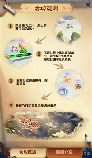 4、纸鸢争锋玩法开启后,会随机匹配99名玩家展开同场竞技。玩家需要操控风筝飞行,过程中每秒都会消耗线长,需躲避障碍物并拾取奖励;若碰到障碍物,线长会额外减少,一旦线长归零,游戏即结束。最终可依据排名和飞行距离领取成就任务奖励。玩法技巧:轻敲操作,避免猛按——每次点击仅让风筝小幅下降,连续快速点击易导致下降过快撞上岩石;把握节奏重于即时反应——不必等看到障碍物再操作,应养成匀速间歇点击的习惯;聚焦空隙而非风筝——用余光留意风筝位置,主视觉关注障碍物间的缺口,提前预判是否会发生碰撞。风筝需通过“锦线寻鸢”抽取碎片解锁并升级,及时升级风筝以提升线长,能增加容错空间,大幅延长飞行极限距离,同时显著降低成就任务奖励的获取难度。