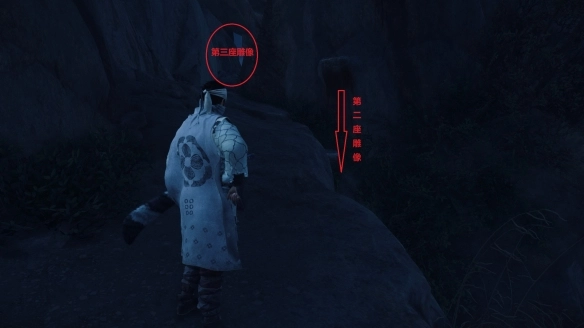 4、攀至顶部后,就能在绳索的对面看到第一座猴子雕像“非礼勿听”,对这座雕像做出“吹笛子”的动作。待过场动画播放完毕,就会回到之前的分岔口。