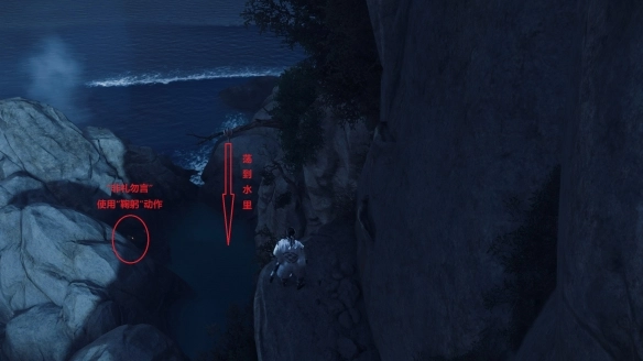 5、穿过石缝后,前行不远便抵达第二处分岔口。此处一侧岩壁设有攀岩点,抓住该攀岩点后会发生崩塌,人会掉到下方的攀岩点,接着继续向下攀爬。
