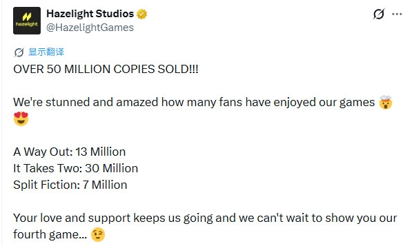 Hazelight官方推特宣布,其旗下三款合作类游戏的总销量已成功突破5000万份,达成新的里程碑。