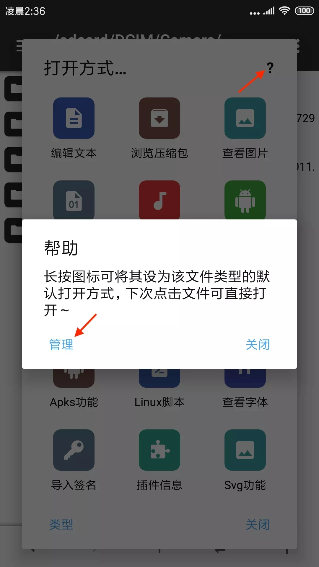 1、在打开方式对话框中点击右上角的?然后再点击管理。