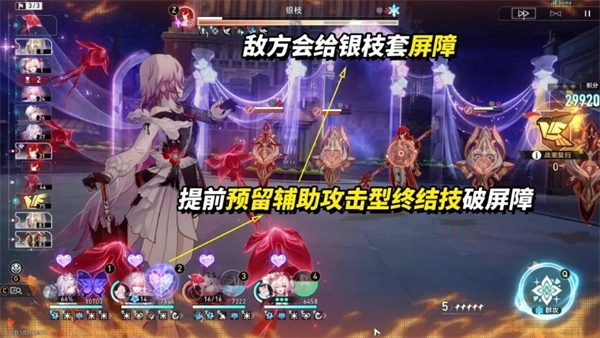 第三波战斗时,要重点留意银枝的状态。对局里当「盾」进行行动时,会给银枝施加1层能抵消伤害的屏障。建议队伍中至少安排1位拥有进攻性终结技的辅助或者副C,在主C行动之前把银枝身上的屏障破除掉,这样就能防止伤害被抵消了。
