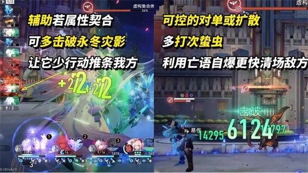 第一波战斗中,优先用对单或带扩散效果的伤害技能集火次蛰虫,借助它死亡时的自爆群体伤害来加速推进第一波进程。如果辅助角色的属性是“物火量子”,可以优先击破永冬灾影以实现推条效果,尽可能降低它的行动频率,从而减少被它命中后推条带来的负面影响。