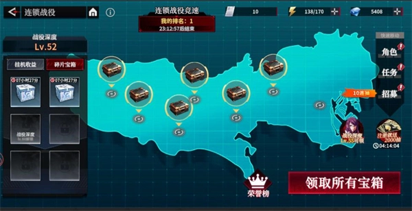 1、连锁战役包含普通、精英与Boss三类关卡,当通关地图内所有关卡并领取完关卡奖励后,就能解锁下一战役深度,获取丰厚资源并提高挂机收益。参与连锁战役可获得大量钻石、招募券、小队经验、角色经验书及各属性进阶石等,是前期角色养成的核心材料来源。此外,连锁战役还与利世满星放送、七日目标和竞速排行活动相关联,通关关卡越多、速度越快,就能越早建立前期优势!