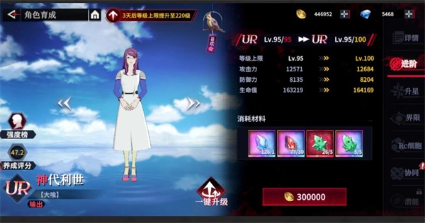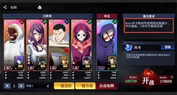 4、若在关卡挑战中无法两回合内取胜,需重点培养主C及输出角色的三个核心方向:等级进阶、界限突破与Rc细胞。材料充足时立即提升,优先强化主C的战力,辅助类角色可最后考虑,待主C养成后再挑战BOSS关卡。若清怪输出不足,可将必杀技替换为群体高伤害的“共斗”技能,用于最终清场。
