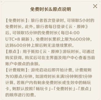 1、【免费时长】:旅行者首次登录《云·原神》时,能领取5小时的免费时长。另外,旅行者每天登录游戏后,可领取15分钟免费时长(每日4:00UTC+8刷新)。免费时长的累积上限是600分钟,一旦达到这个上限,就不能再继续累积了。