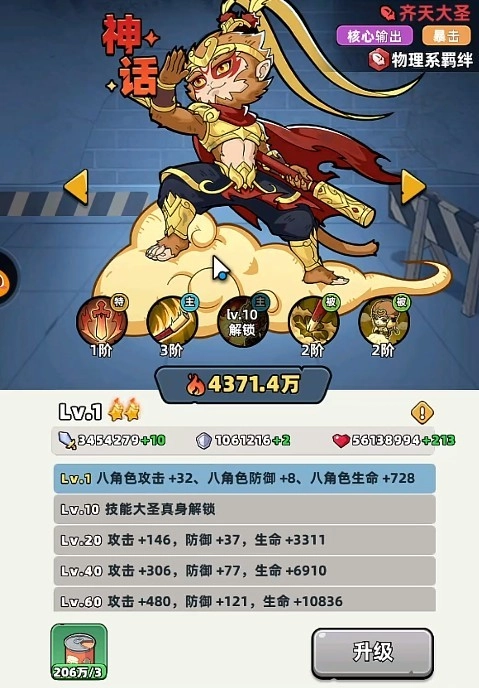 作为输出定位的角色,在挑战环节中组队十分灵活,队伍搭配上没有太多约束。若想提升输出表现,玩家可以选择齐天大圣——作为游戏的核心输出角色,它能借助物理系羁绊对敌人造成暴击伤害。当两名成员等级相同时,彼此配合能进一步增强队伍的整体战力。