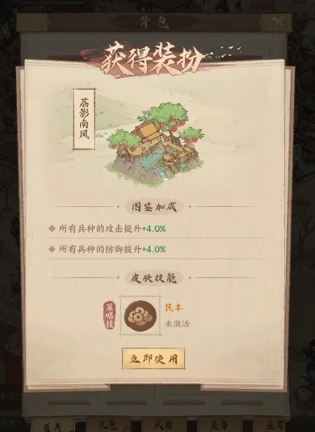 获取该道具后,可手动激活九州县邑的初阶「荔影南风」装扮。获得装扮后,可前往书阁-图鉴进行激活。