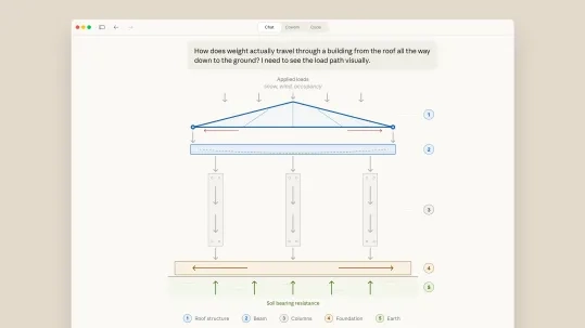 比如,Anthropic提到,围绕元素周期表展开的对话或许会让Claude生成一个带有交互功能的元素周期表可视化内容,你可以点击周期表内的区域来获取更详细的信息。还有一个例子能体现Claude是怎样生成与建筑中重量传递问题相关的可视化内容的。