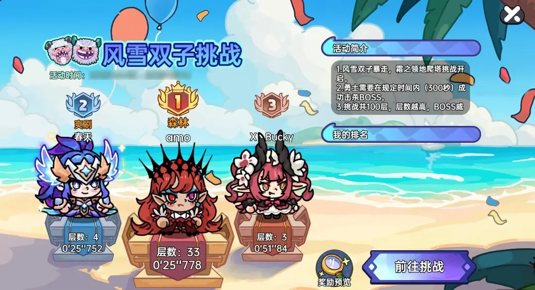 霜之领地的风雪双子突然失控暴走,紧急召集勇士前往讨伐!传闻挑战的层数越高,所能获取的奖励就越丰厚,更有限时排行榜奖励等待各位赢取!是时候亮出你真正的实力了,不知最终谁能荣登榜单之巅呢?