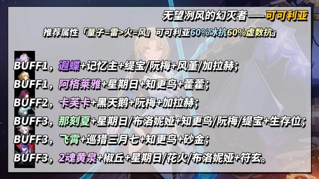 优势属性为「量子=雷>火=风」,敌方特殊抗性方面,可可利亚拥有60%冰抗与60%虚数抗,因此非必要情况下不建议选用冰和虚数属性的输出角色。