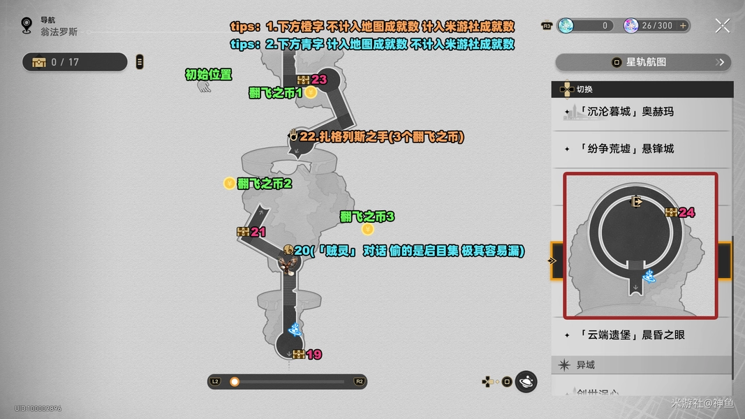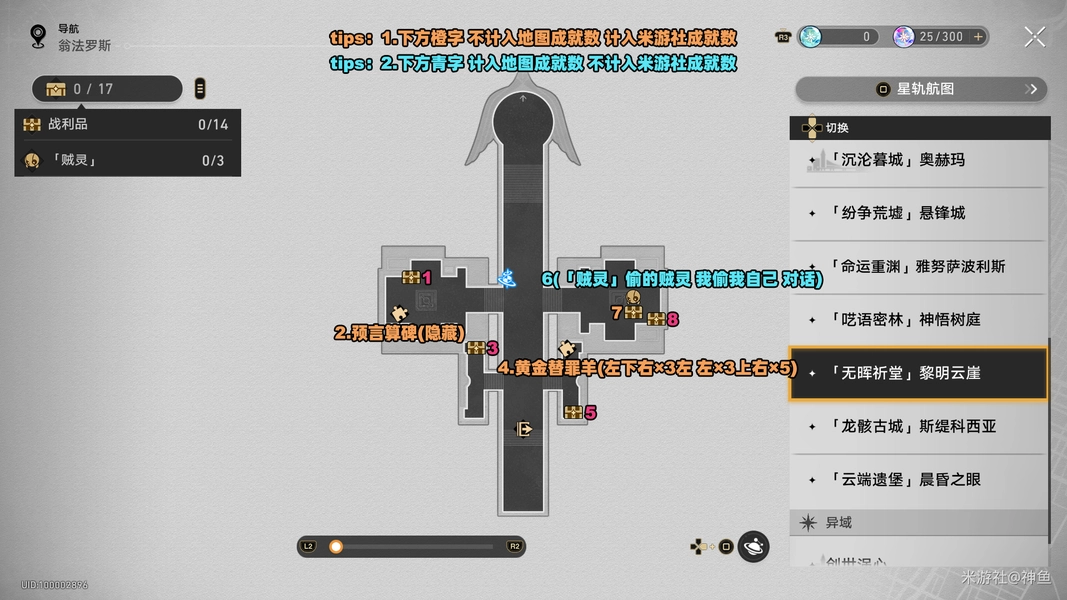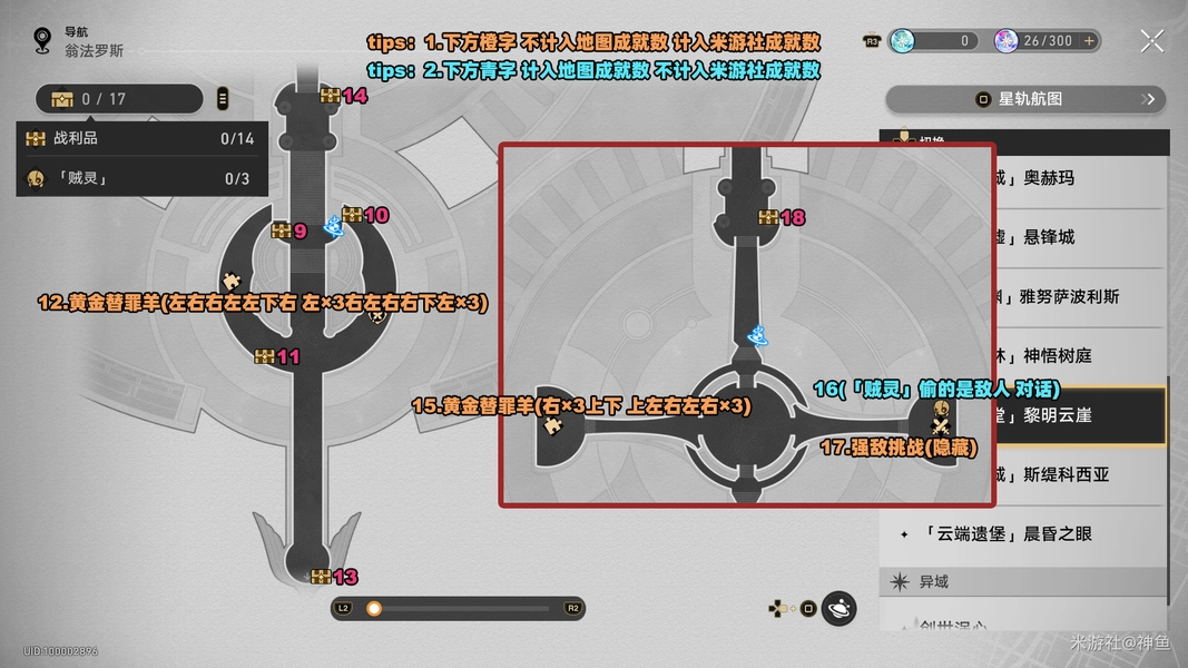 「1个扎格列斯之手」「3个黄金替罪羊」「1个预言算碑」「1个强敌挑战」「1个贼灵隐藏战利品」以及「9个非本帖提及的任务」,这些内容不计入地图成就数量,仅计入米游社成就数量。