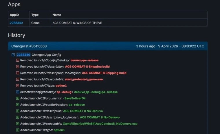 不过现在情况就不好说了,今天在SteamDB里,开发者把测试D加密的相关信息给移除了,与此同时,却冒出了一个耐人寻味的可执行文件——“AceCombat8_NoDenuvo.exe”。