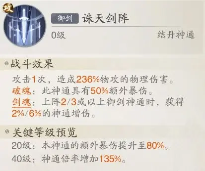 结丹期建议优先提升诛天剑阵,这套阵法单体伤害很高,不管是爬塔闯关还是PVP对战都十分实用。