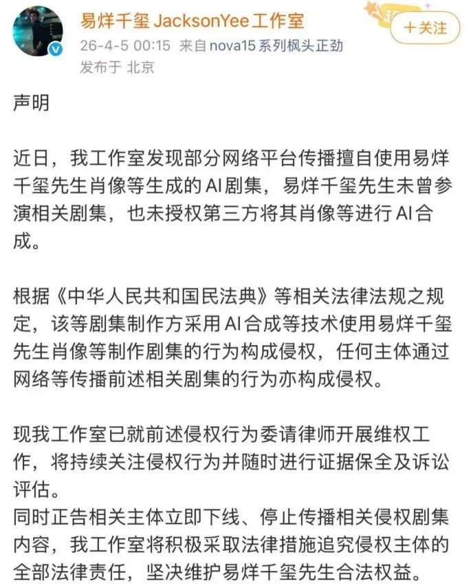4月5日,易烊千玺工作室发布声明,表示易烊千玺既没有参演过利用其肖像生成的AI剧集,也没有授权任何第三方开展AI合成相关活动。