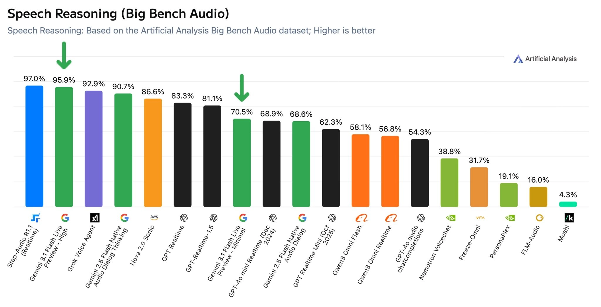 根据Artificial Analysis的数据,该模型在Big Bench Audio基准测试中,“高”思维模式下评分达95.9%,仅次于Step-Audio R1.1 Realtime(97.0%),响应时间为2.98秒;而在“最低”状态下,质量评分降至70.5%,响应时间则缩短至0.96秒。